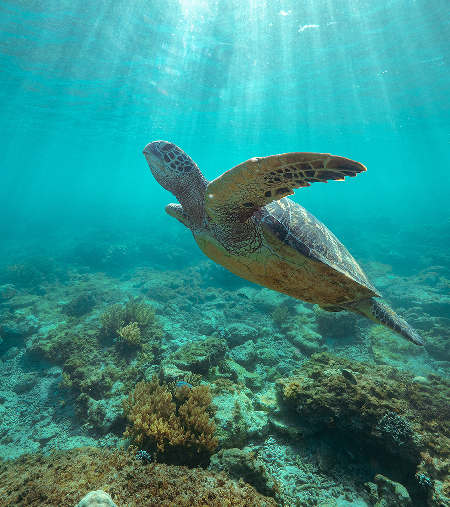 A tropical reef specialist, hunted for its beautifully patterned shell. The hawksbill is listed as Critically Endangered and appears in CITES Appendix I, meaning international commercial trade is prohibited.