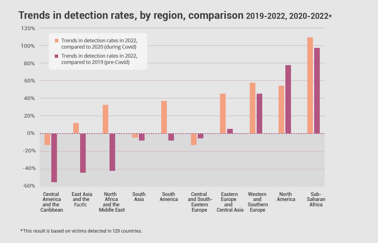 By 2022, the number of detected trafficking victims rose 25 percent compared with 2019 and 43 percent compared with 2020, at the height of COVID restrictions. That means trafficking not only intensified during the pandemic but exceeded pre-pandemic levels once borders reopened. Regional differences were stark. Sub-Saharan Africa, North America, and Western Europe recorded significant increases compared with 2019. South America, Eastern Europe, Central Asia, East Asia, the Pacific, North Africa, and the Middle East saw detections rise from 2020 but remain below 2019 figures. Central America and the Caribbean reported the steepest decline since 2020, now at their lowest levels in years.