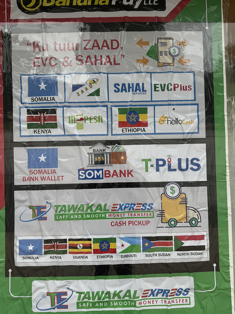 “Camel Milk Sold Here” reads a placard on the front door of a Somali-owned store, which shares space with a money-transfer kiosk displaying the flags of Kenya, Ethiopia, Somalia, and the corporate logos of remittance agencies with names like Tawakal Express, EVC Plus and Sahal Services.
