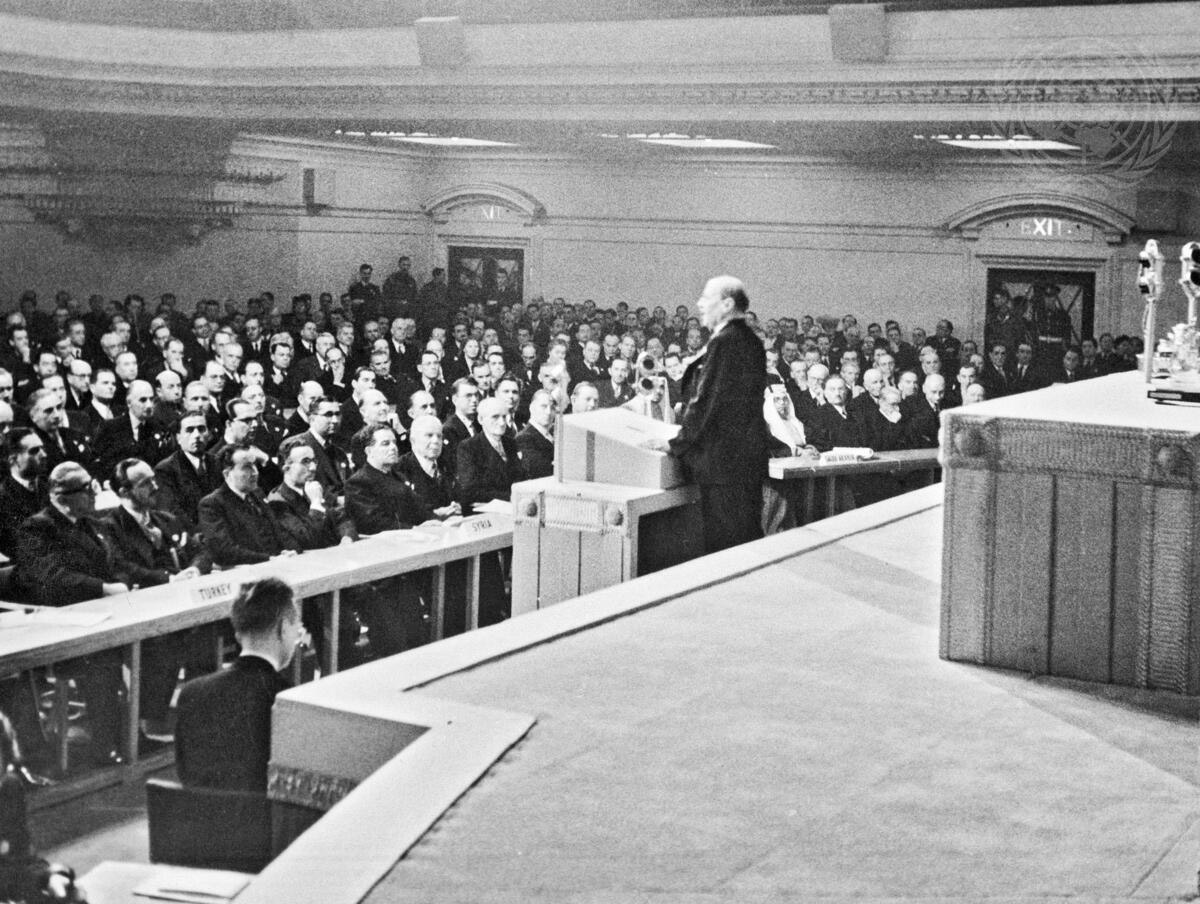 The first session of the United Nations General Assembly opened on 10 January 1946 at Central Hall in London, United Kingdom. Clement Attlee, Prime Minister of the United Kingdom, addressing the General Assembly. UN Photo/Marcel Bolomey