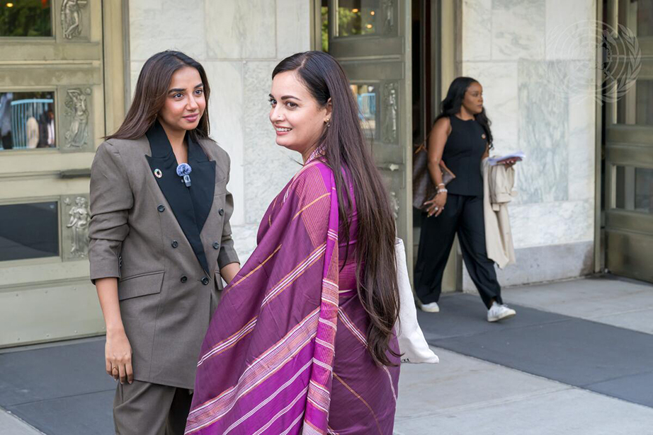 Prajakta Koli (left), YouTuber and UNDP India Youth Climate Champion, and Dia Mirza, Actor, Producer, U.N. Environment Goodwill Ambassador & United Nations Secretary-General Advocate for Sustainable Development Goals, outside the SDG Media Zone at U.N. Headquarters during the first day of the high-level week and the U.N. General Assembly Debate. Credit: U.N. Photo/Mark Garten
